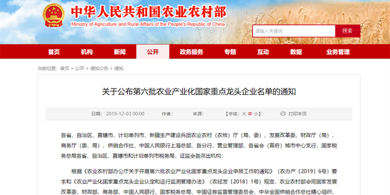 12月3日,农业农村部、国家发展改革委、财政部、商务部、中国人民银行、国家税务总局、中国证券监督管理委员会、中华全国供销合作总社联合印发通知,公布第六批 299 家农业产业化国家重点龙头企业名单,龙江米兰官方端网站登录入口-米兰online(中国)公司榜上有名。